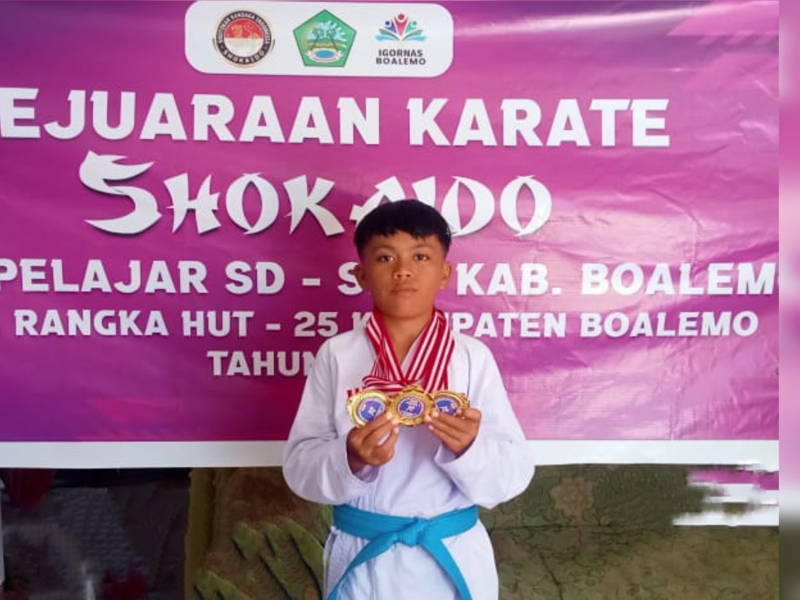 FAKTAPUBLIK. ID – Siswa SDN 4 Botumoito, Moh Haikal Ibrahim terus mengukir prestasi di bidang olahraga karate shokaido. Setelah menyabet beberapa medali emas diajang kejuaraan Kemenpora yang di gelar di Kota Bitung Sulawesi Utara dan sempat menempati posisi ke dua pada kejuaraan Open Turnament Budokai Championship III,dan Festival Anwar Hafid Cup 2024 yang digelar di SMA NOR Tadulako,Kota Palu, Sulawesi Tengah,pada September lalu, kini Moh Haikal Ibrahim kembali menorehkan prestasi dengan menyabet 3 medali emas diajang kejuaraan Karate Shokaido antar Pelajar, SD,dan SMP, yang di gelar di Kecamatan Tilamuta,Kabupaten Boalemo,Senin (28/10/2024).