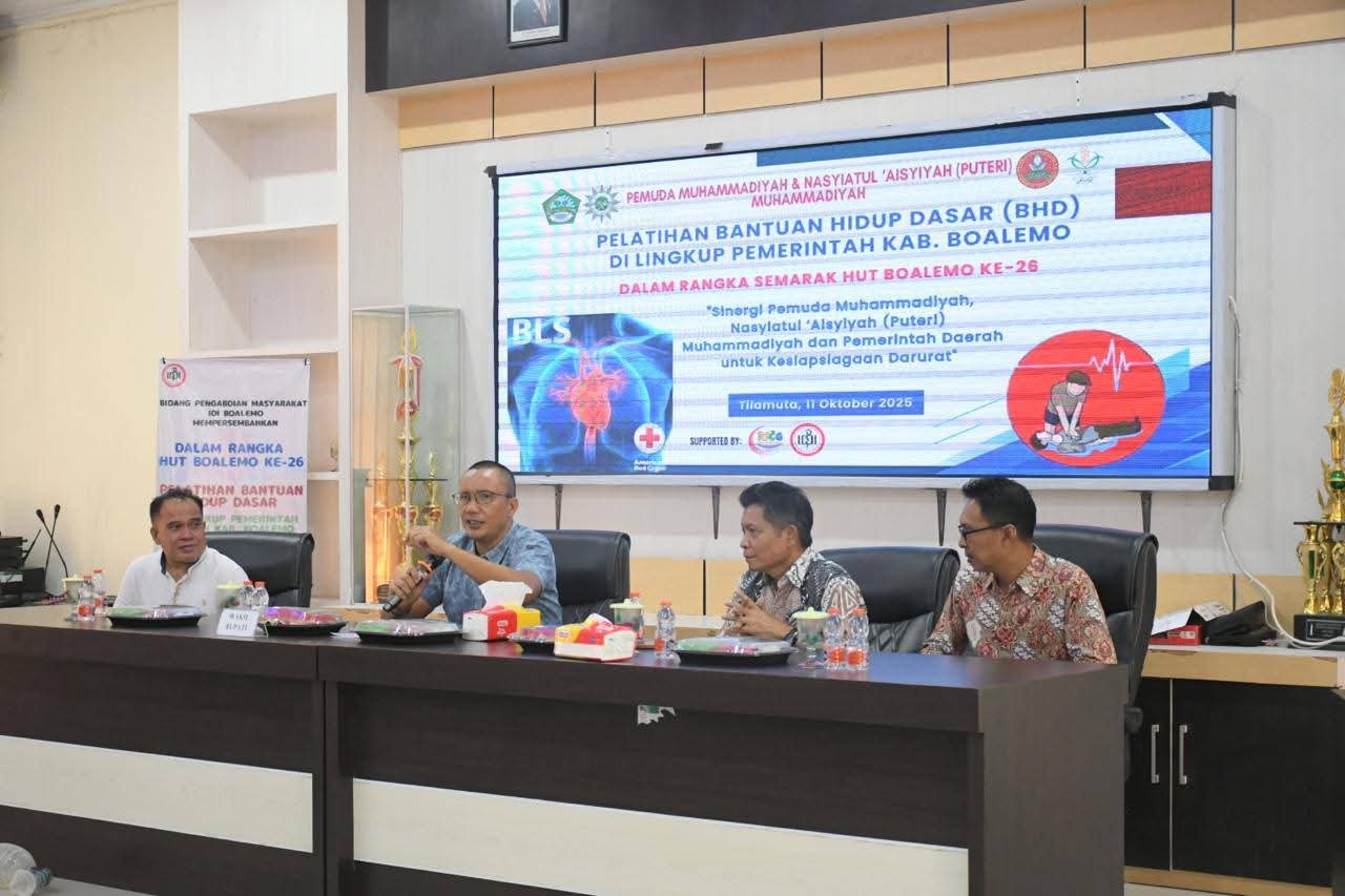 FAKTAPUBLIK.ID – Sabtu (11/10/2025), Pemuda Muhammadiyah bersama Nasyiatul Aisyiyah (NA) Boalemo mengagas Pelatihan Bantuan Hidup Dasar (BHD) dilingkungan Pemerintah Kabupaten Boalemo,. Kegiatan yang berlangsung di ruang rapat Dinas Kesehatan tersebut secara resmi dibuka oleh Wakil Bupati Boalemo, Lahmudin Hambali, S.Sos., M.Si.