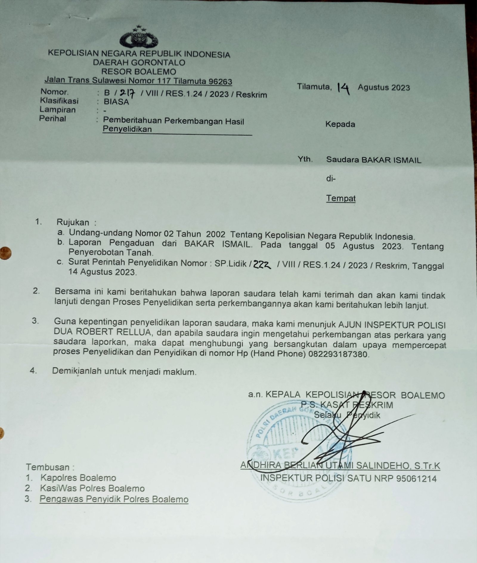 Sementara itu Bakar Ismail selaku korban penyerobotan tanah mengatakan bahwa pada tanggal 7 Agustus 2023 Penyidik Reskrim Polres Boalemo telah melakukan pengambilan berita acara perkara (BAP) kepada dirinya.