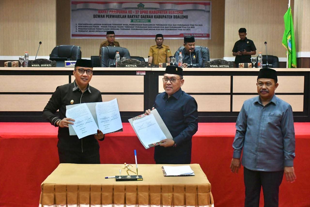 Sidang paripurna diakhiri dengan penandatanganan persetujuan terhadap Rancangan Perubahan Anggaran Pendapatan dan Belanja Daerah (APBD) Tahun Anggaran 2025, oleh Pemerintah Kabupaten Boalemo bersama Dewan Perwakilan Rakyat Daerah (DPRD), berlangsung di Ruang Sidang DPRD Boalemo, Selasa (23/9/2025).